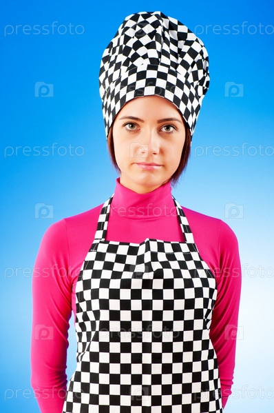 Девушка в черно-белом фартуке и колпаке, на голубом фоне
