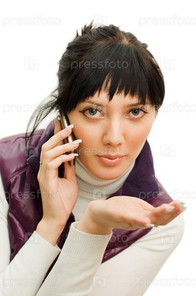 Девушка разговаривает по телефону, изолированная на белом фоне