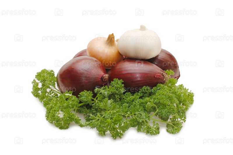 Лук, чеснок и петрушка на белом фоне