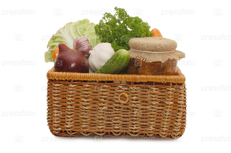 Свежие и консервированные овощи в плетеной корзине