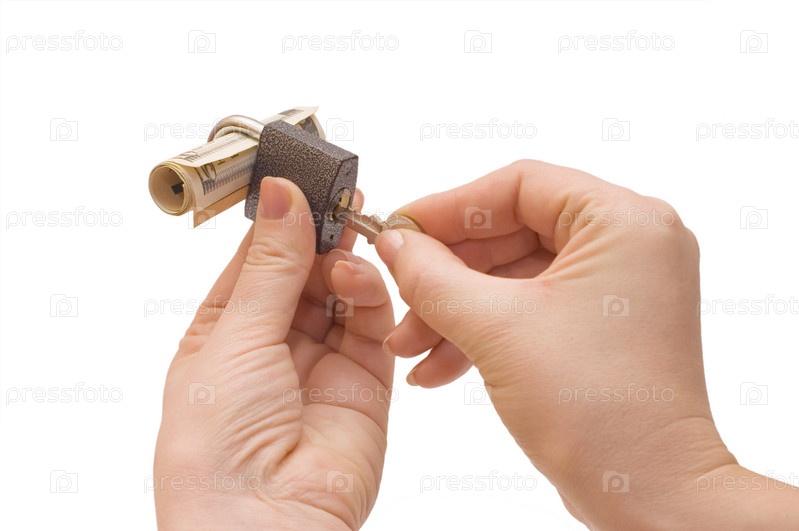 Руки, держащие навесной замок с долларом и ключ, на белом фоне