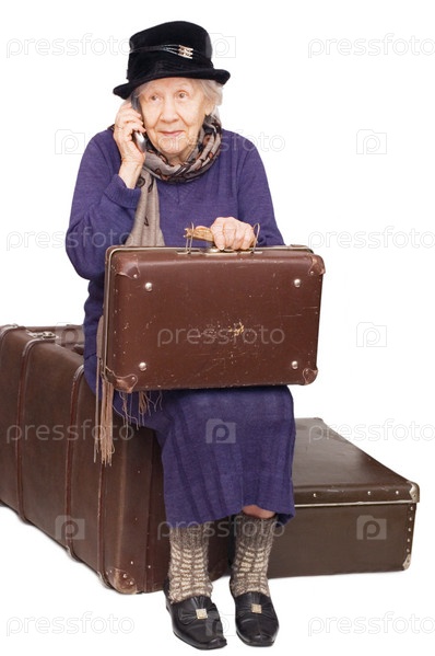 Старушка с чемоданами разговаривает по телефону