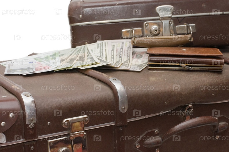 Деньги и кошелек лежат на старом чемодане