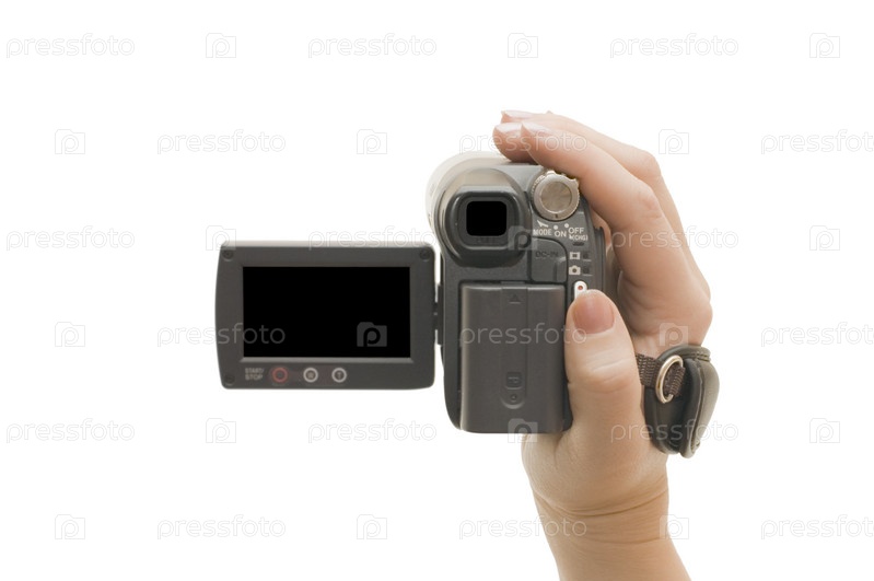 Видеокамера в женской руке на белом фоне
