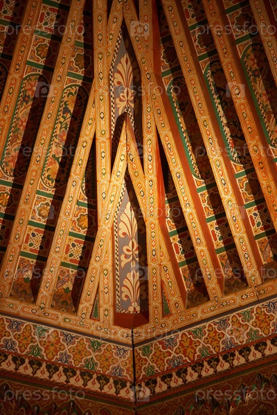 Фрагмент ярко освещенного деревянного потолка в бывшей исламской школе, Марокко