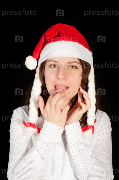 Молодая девушка в колпаке Санта-Клауса на черном фоне