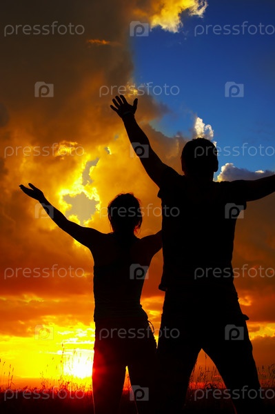 Два человека на фоне заходящего солнца