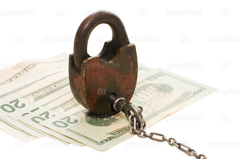 Замок с ключом и деньги на белом фоне