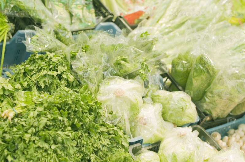 Зеленые овощи на полке в супермаркете
