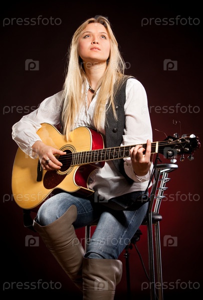 Девушка с гитарой на темно-красном фоне