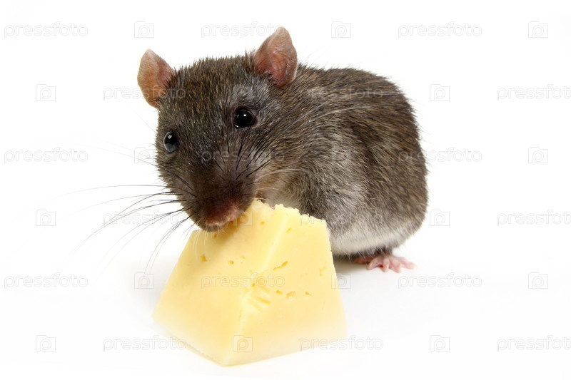Большая серая крыса на белом фоне с куском сыра