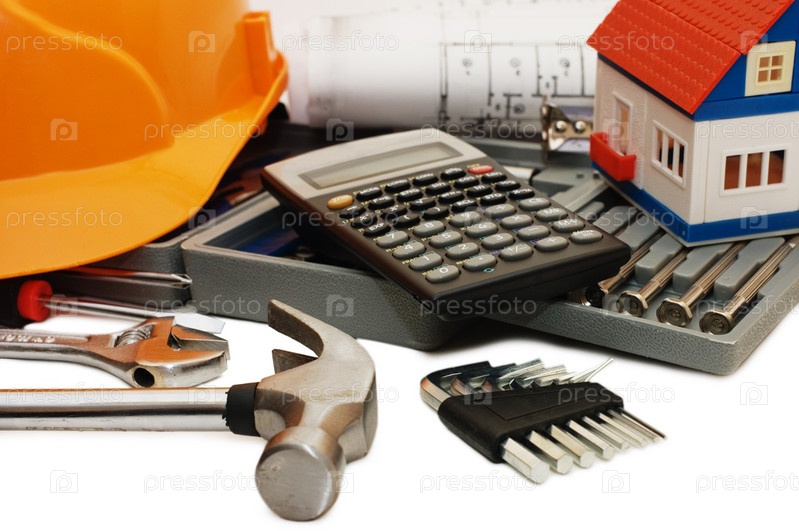 Строительные инструменты, каска, чертежи и калькулятор на столе