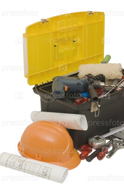 Строительные инструменты, чертежи и каска на белом фоне