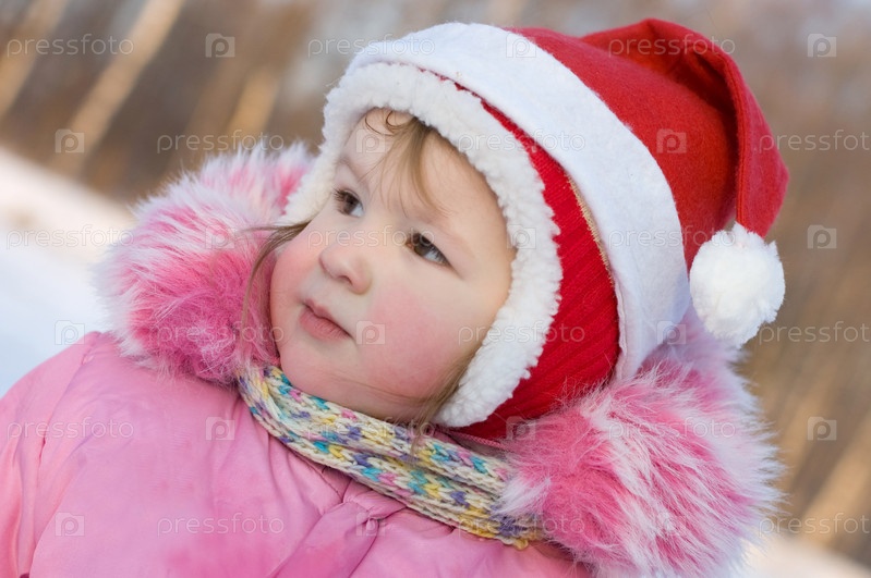 Портрет девочки в красной шапке на фоне зимнего леса