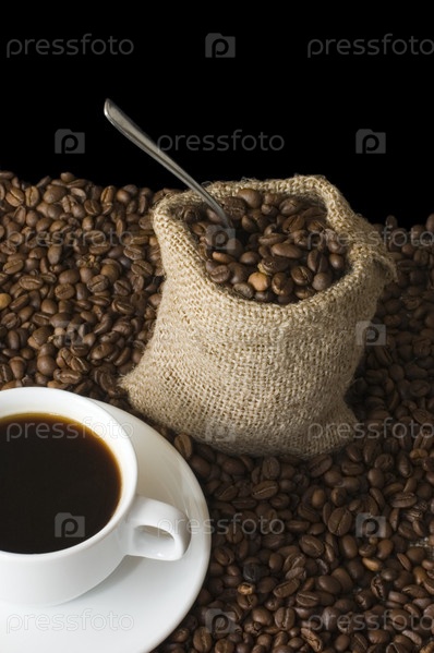 Чашка кофе и полный брезентовый мешок на кофейных зернах