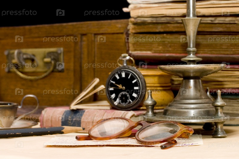 Стопка книг и различные старые вещи крупным планом на черном фоне