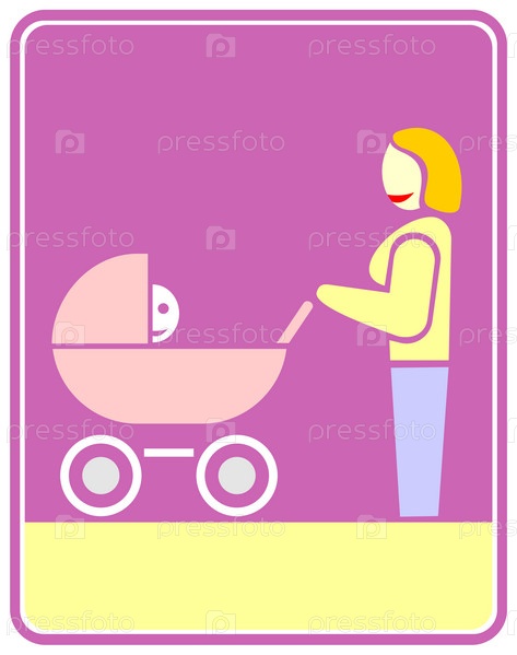 Молодая мать, несущая своего ребенка в детской коляске. векторная иллюстрация. Многоцветный значок, знак