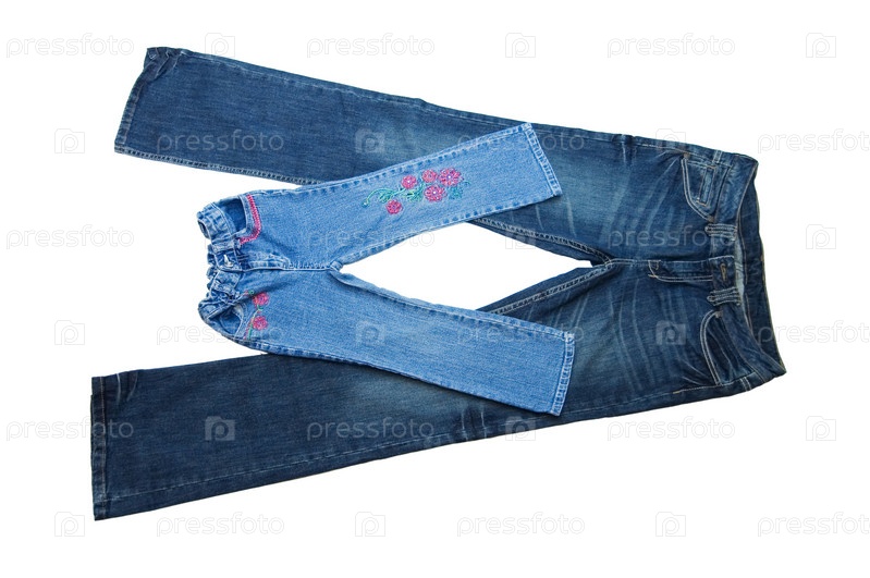 Джинсы для детей и взрослых на белом фоне