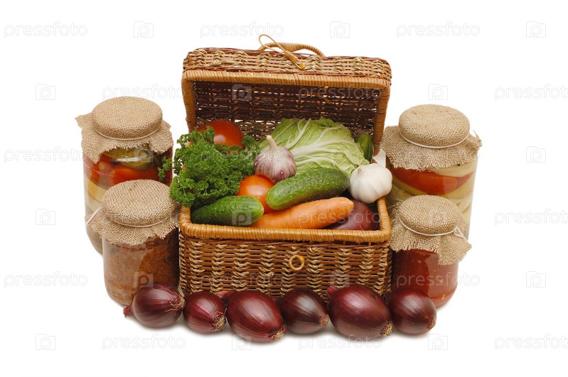 Свежие и консервированные овощи в плетеной корзинке