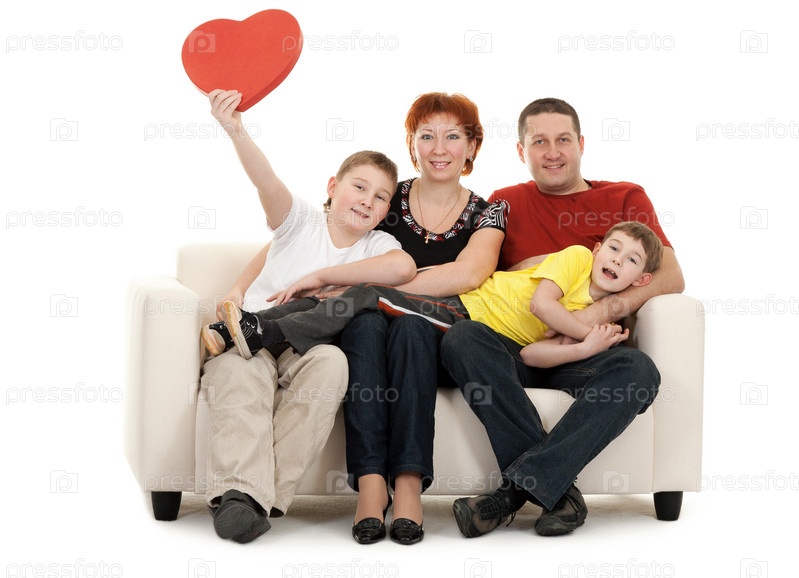 Портрет счастливой семьи на диване на белом фоне