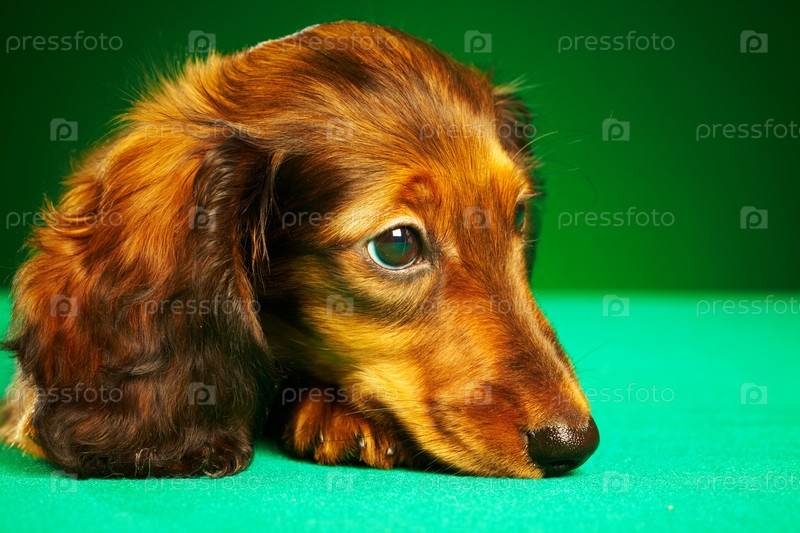 Щенок таксы на зеленом фоне
