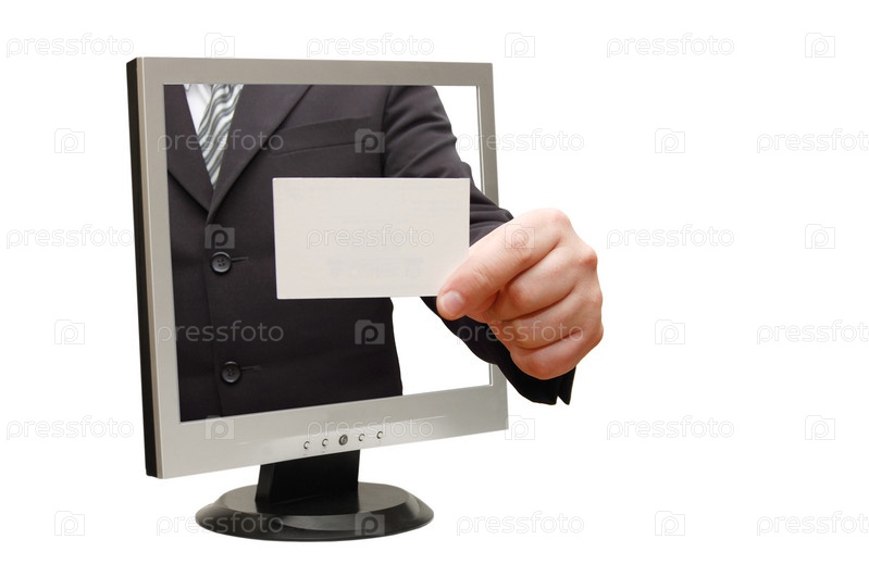 Молодой бизнесмен протягивает визитку из монитора на белом фоне