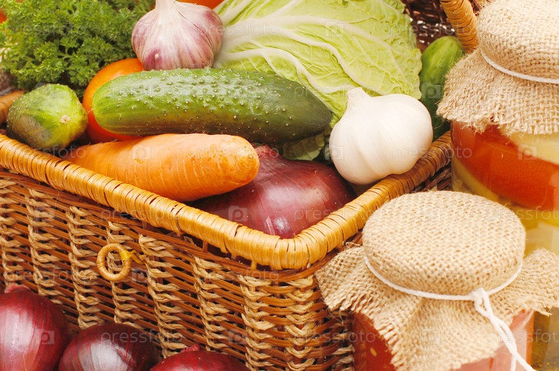 Свежие и консервированные овощи в плетеной корзине