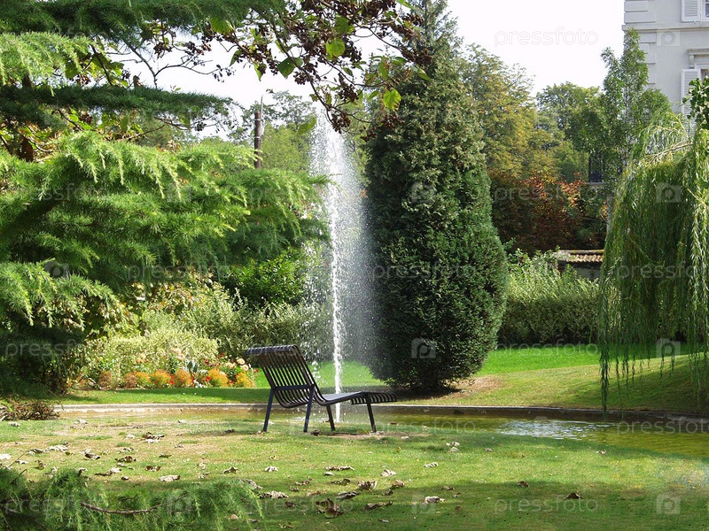 Фонтан и скамья в городском саду. Пригород Реймса. Франция
