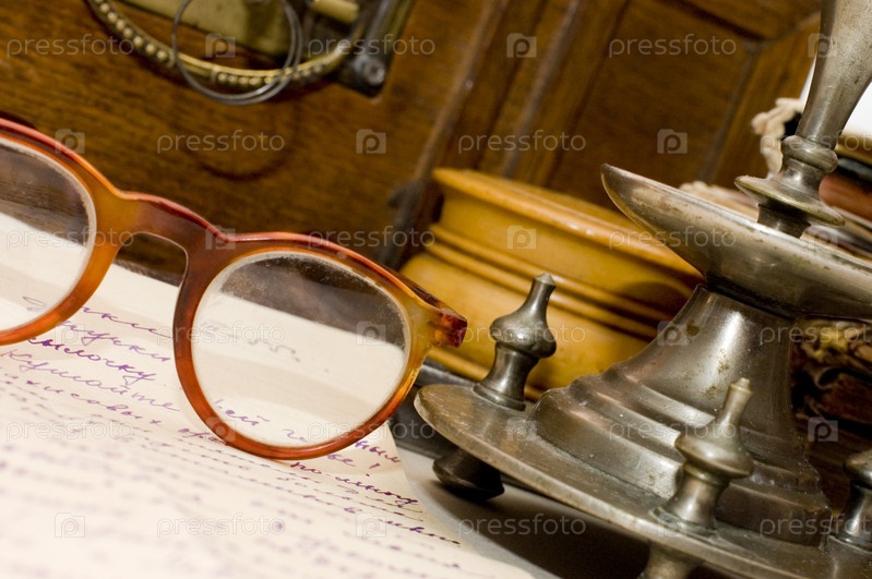 Очки и письмо на фоне старинных антикварных вещей