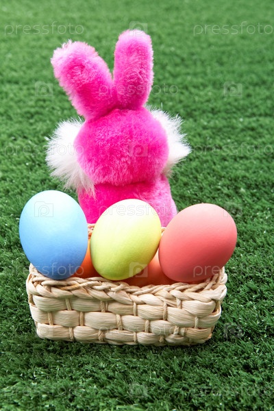 Разноцветные яркие куриные яйца в корзинке с розовым кроликом на зеленой траве