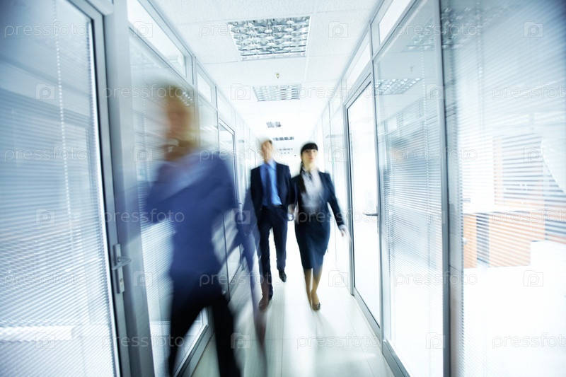 Сотрудники офиса идут по коридору, съемка с длинной выдержкой