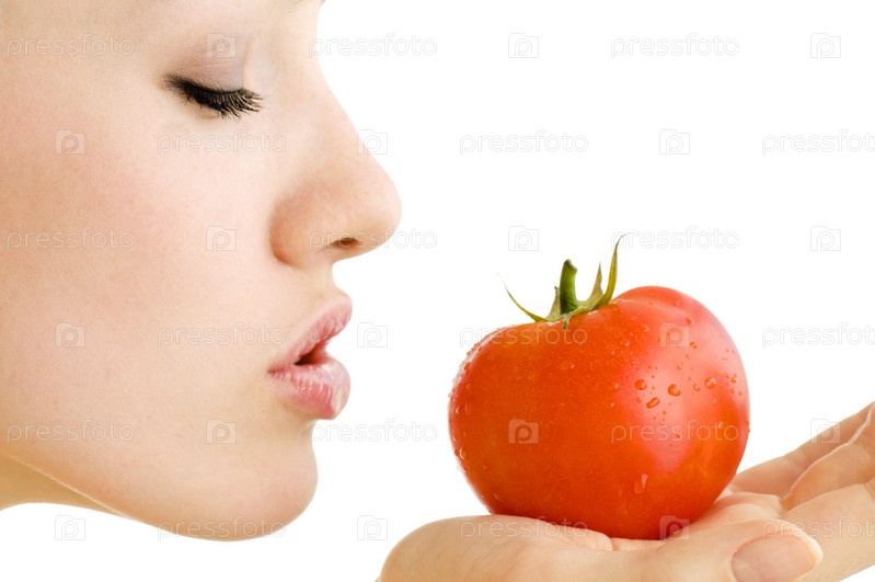 Девушка со спелым красным помидором