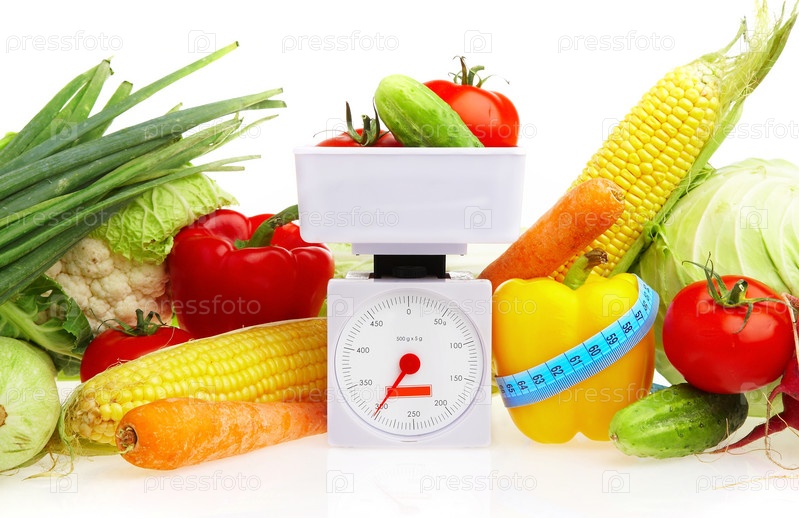 Свежие овощи, весы и измерительная лента на белом фоне