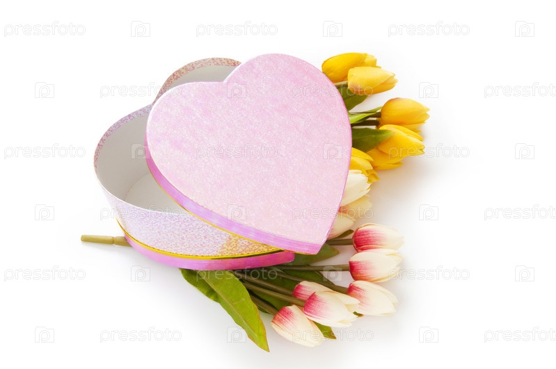 Розовая подарочная коробка в форме сердца на тюльпанах