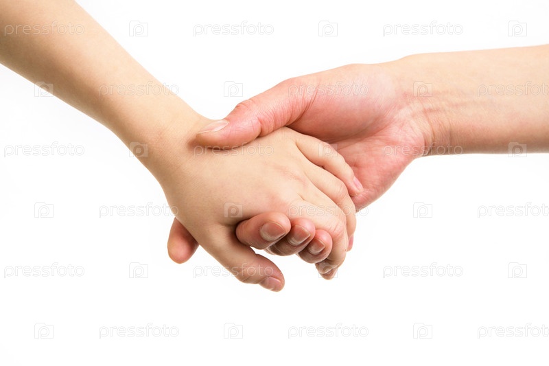 Рука взрослого человека держит руку ребенка, крупный план на белом фоне