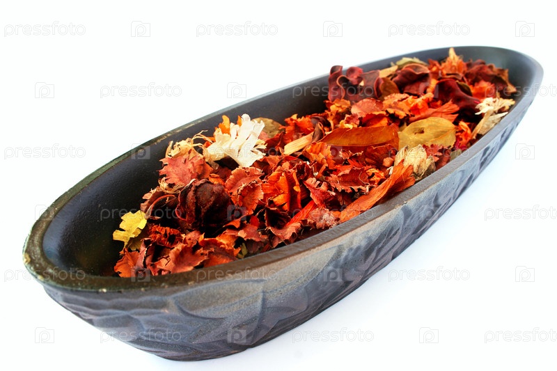 Сухие лепестки цветов в деревянной вазе на белом фоне