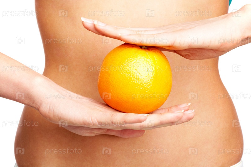 Женщина держит апельсин на фоне обнаженного живота, крупный план
