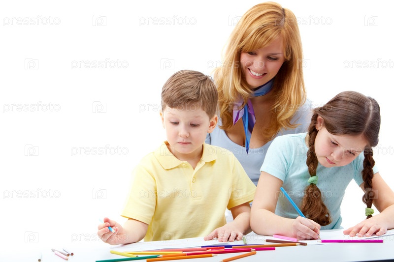Учительница и дети, рисующие карандашами, изолированные на белом фоне