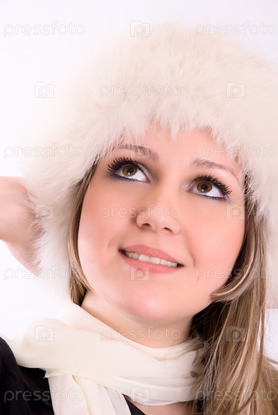 Молодая женщина в пушистой шапке крупным планом, на белом фоне