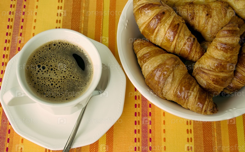 Черный кофе в белой чашке и кроассанты на цветной скатерти