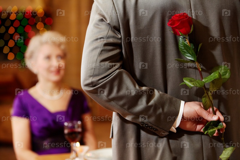 Мужчина, держащий за спиной розу, и женщина на заднем плане