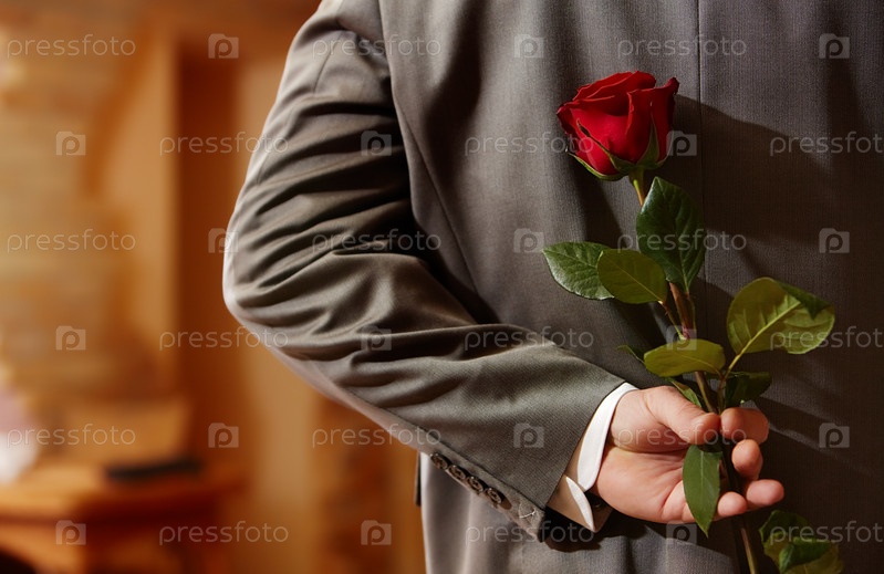 Мужчина, держащий за спиной розу крупным планом