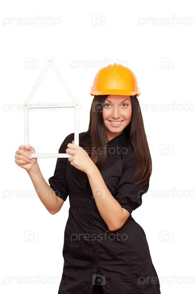 Девушка в строительной каске показывает домик из рулетки