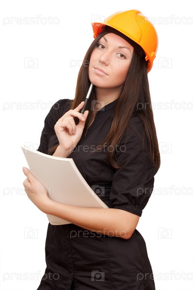 Девушка в строительной каске с листами бумаги