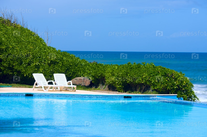 Два пустых лежака на пляже возле бассейна в солнечный день