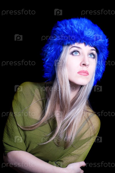 Девушка в синей шапке на черном фоне