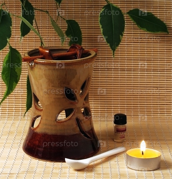 Аромалампа и горящая свеча в гильзе на бамбуковой салфетке