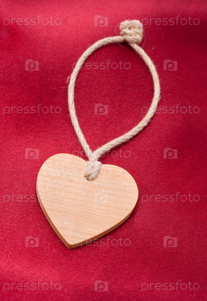 Деревянное сердце на красном атласном занавесе - Сувенир в день святого Валентина (Valentine's Day)