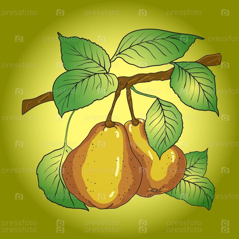 Векторный рисунок груш, висящих на ветке, с зелеными листьями