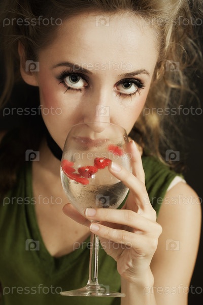 Блондинка с ярким макияжем пьет из бокала с сердечками
